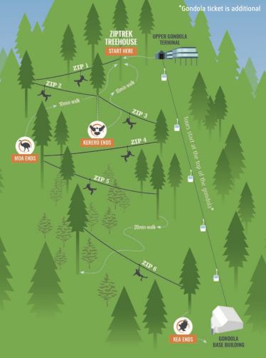 All Ziptrek tours depart from the Ziptrek Treehouse, at the top of the Skyline gondola.